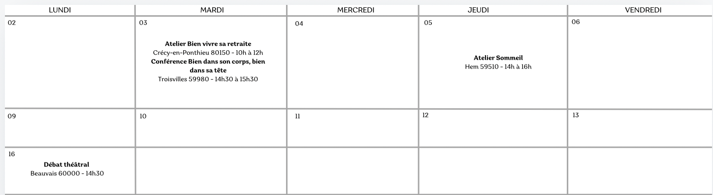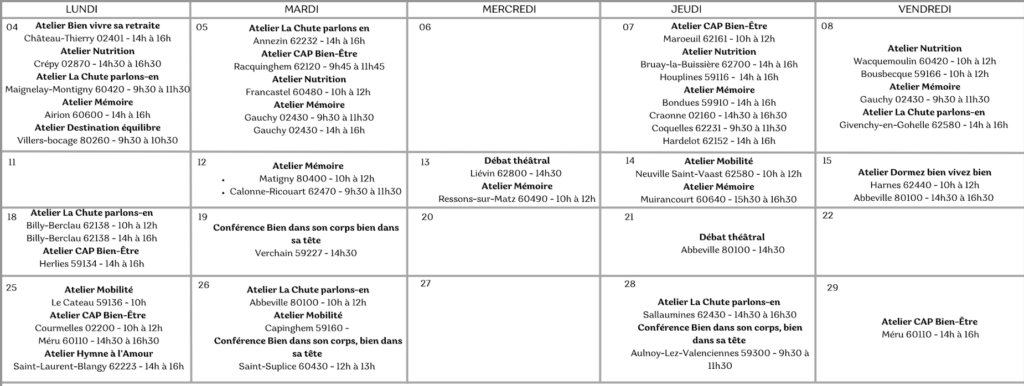 **Le calendrier de décembre sera entièrement disponible lors de la newsletter du mois de décembre.
